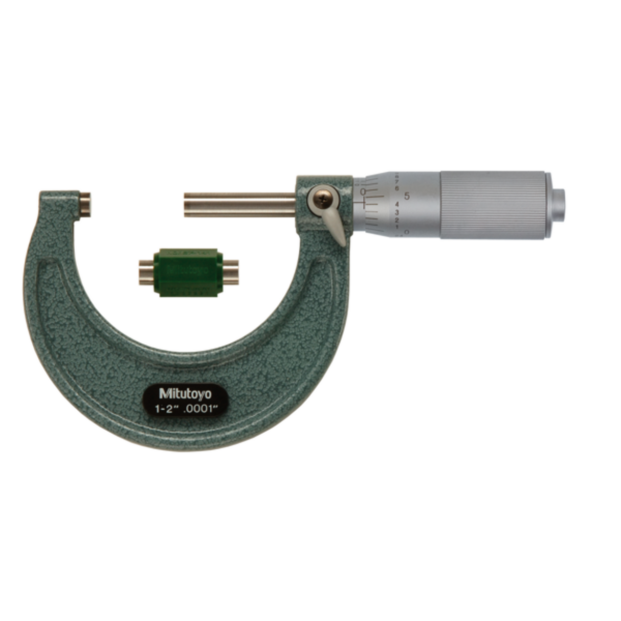 Un micrómetro Mitutoyo básico, rentable y no digital con Trinquete para garantizar una medición repetible.