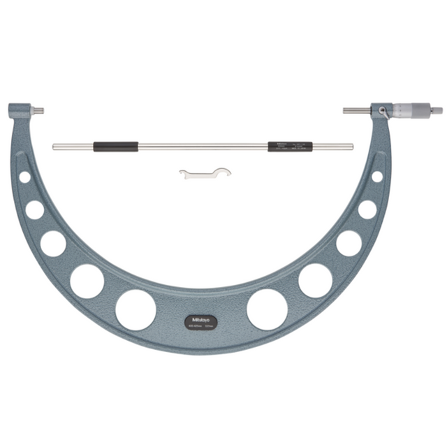 Un micrómetro Mitutoyo básico, rentable y no digital con Trinquete para garantizar una medición repetible.