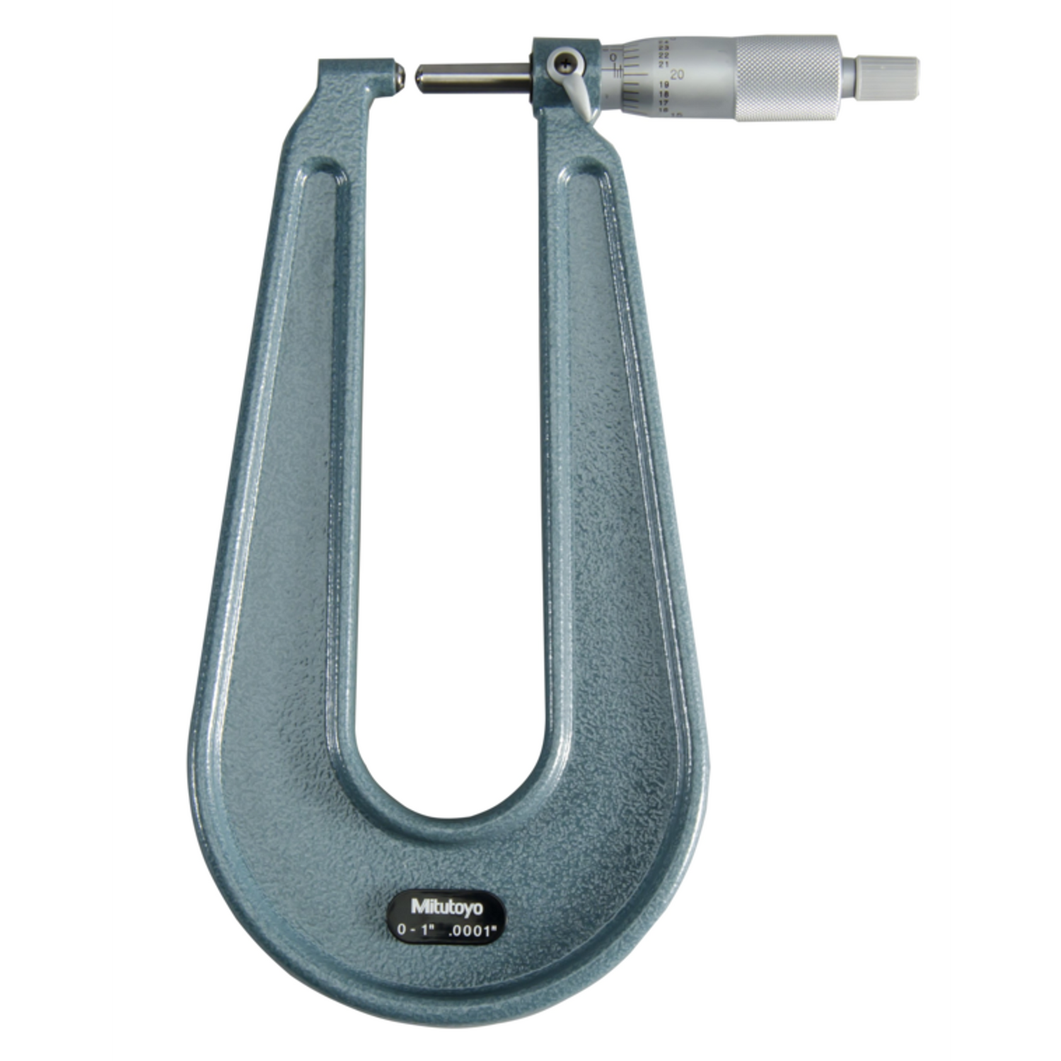 Un micrómetro no digital Mitutoyo provisto de un extremo del husillo y un tope con radios esféricos y un marco profundo para permitir la medición del espesor de la lámina de metal más lejos del borde de lo que es posible con un micrómetro estándar. Un Trinquete garantiza una medición repetible.