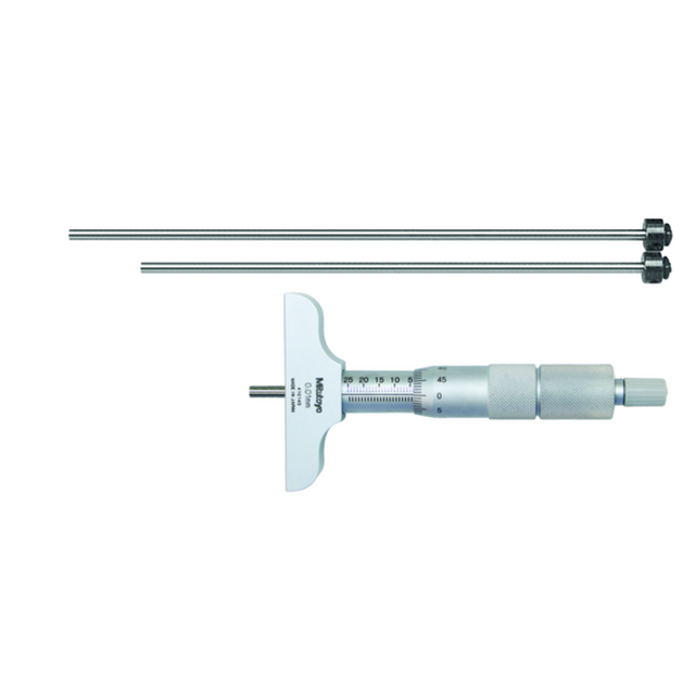 Micrómetro para profundidad Mitutoyo usando varillas de medición intercambiables para cubrir un amplio intervalo de medición. La base de 60 mm está hecha de acero para herramientas, Endurecido y rectificado con una superficie de referencia micro-lapeada.