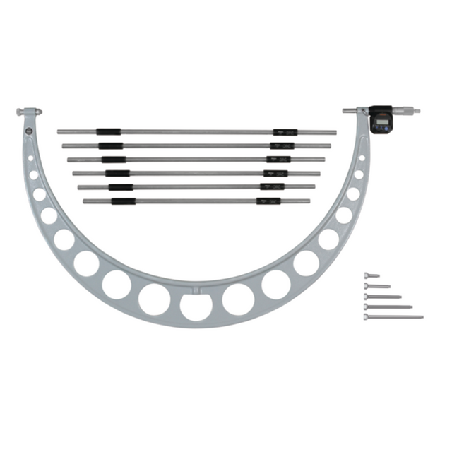 Micrómetro digital Mitutoyo provisto de topes fácilmente intercambiables para permitir un amplio intervalo de medición desde un solo instrumento. Un trinquete garantiza una medición repetible Salida de datos Digimatic.