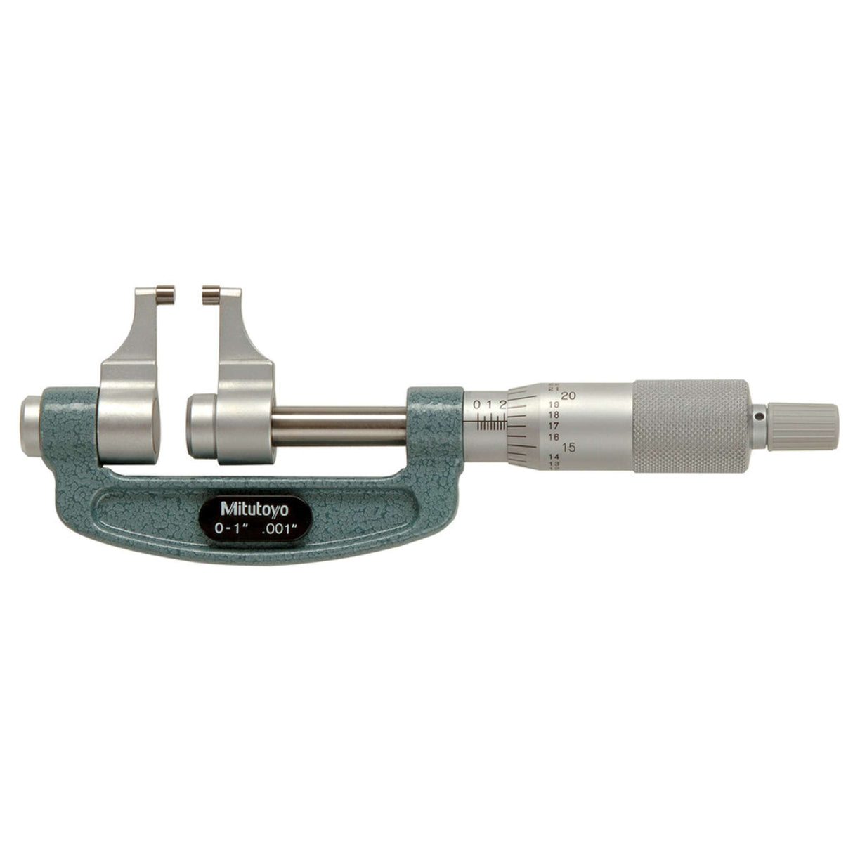 Un micrómetro no digital Mitutoyo provisto de puntas de calibrador para permitir la medición en espacios reducidos. Un trinquete garantiza una medición repetible.