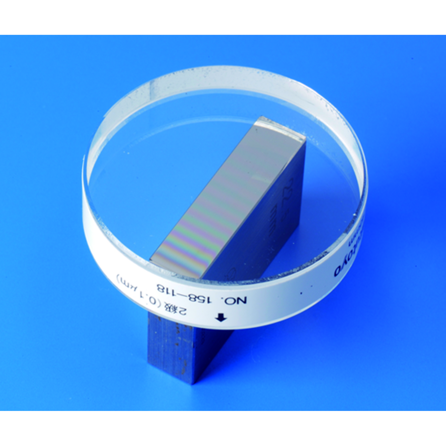 Un plano óptico circular Mitutoyo con una superficie pulida con exactitud para inspeccionar la planitud de superficies de referencia de placas o bloques patrón, caras de contacto micrométricas o cualquier otra superficie muy plana de alta reflectividad.
