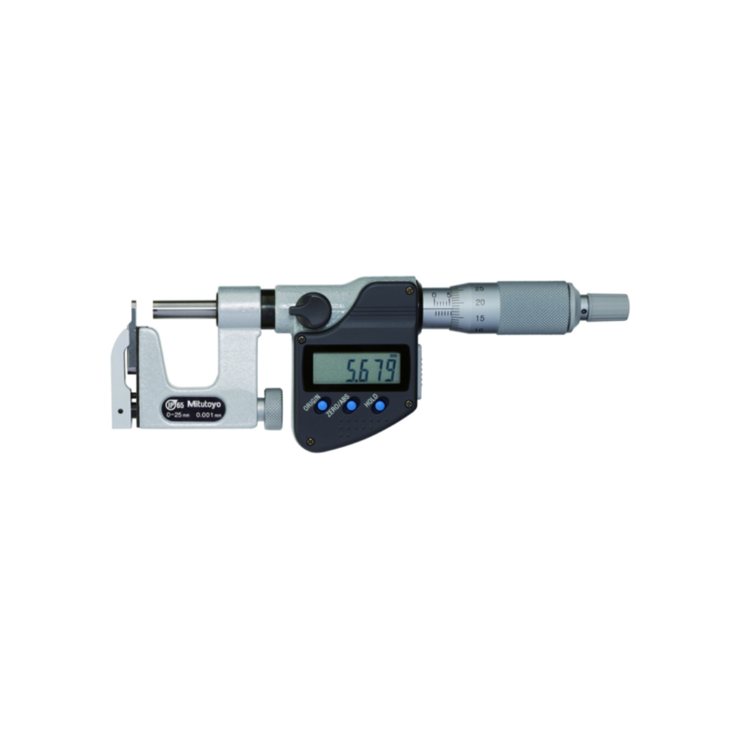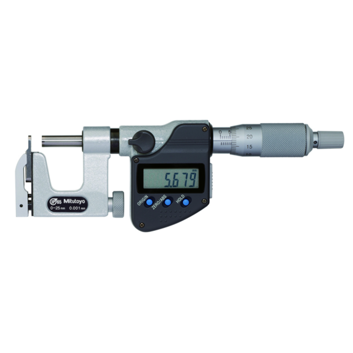 Este micrómetro Digimatic tipo punta intercambiable le permite medir una variedad de características diferentes. Ofrece los siguientes beneficios: Mide el espesor de la tubería, la distancia al borde del hombro, la altura de la cabeza del remache, etc., con topes intercambiables (Tope Plano, Tope cilíndrico, Tope en V).